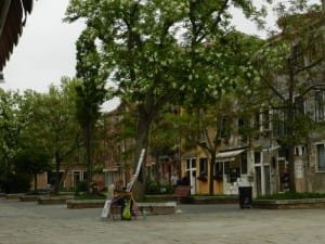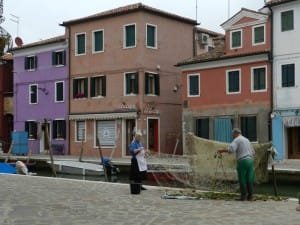Al mattino, verso le otto, ci dotiamo del biglietto/traghetti giornaliero (20 euro) e puntiamo su Burano. Ci accoglie una cittadina ancora sonnolenta, quasi deserta. Siamo nell’isola dei merletti. I colori vivaci – ma a tono – delle case, le piazzette con i pozzi e le fontane, i canali e l’assoluta assenza di traffico a motore conferiscono al piccolo borgo antico un sapore indescrivibile. Perfino difficile da immaginare. Lentamente la cittadina si sveglia, le botteghe aprono, la mercanzia viene esposta per strada. Si vedono le merlettaie al lavoro e lavori di pregevole fattura. La vita scorre lenta, non siamo in piena stagione turistica, ma a noi piace tanto così.