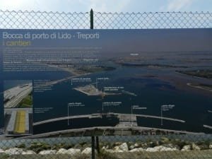 Verso sera siamo arrivati a Punta Sabbioni, transitando per Jesolo. A distanza di trecento metri dall’imbarco dei traghetti c’è una buona area-camper, dotata di servizi. Euro 23 per 24 ore. La prima immagine che ci appare è il cantiere del Mose e una enorme nave da crociera in uscita da San Marco.