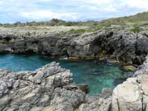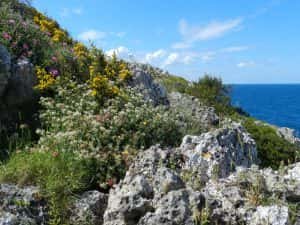 La roccia carsica presenta innumerevoli grotte, anche sottomarine, ricche di reperti fossili e molto frequentate dagli speleologi e dai sub. Anche qui splendide fioriture.