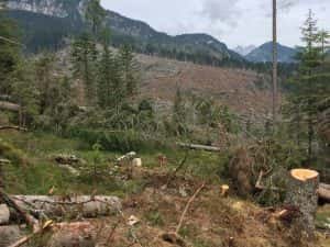 Da queste parti la tempesta dello scorso ottobre ha fatto non troppi danni. Qua e la si vedono chiazze di alberi tutti abbattuti, mentre entrando nel bosco all’apparenza intonso si incontrano spesso singoli alberi caduti i quali creano difficoltà di passaggio. Non so dire se tutti i sentieri sono aperti, tanti certamente si. La situazione appare molto più pesante invece nell’alta val Visdende, così come si può vedere dando un’occhiata, su, dalle sorgenti del Piave. Gli abitanti di Sappada stanno raccogliendo i tronchi caduti, i quali, dopo essere stati ripuliti in apposite segherie, a quanto pare dalle targhe dei grandi camion, prendono la via della Slovenia.