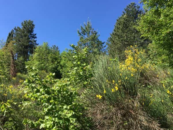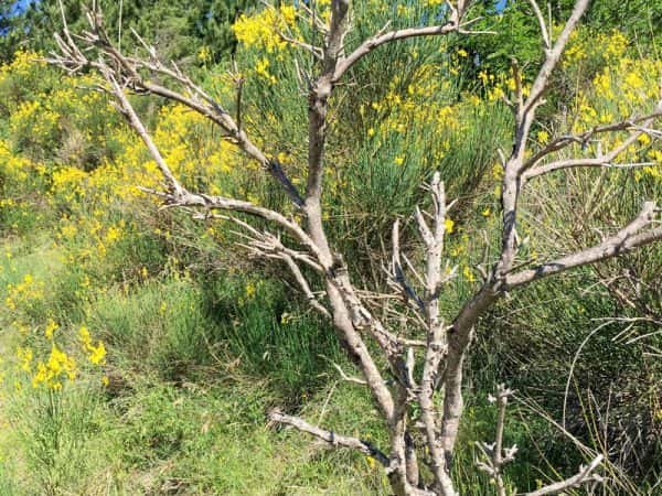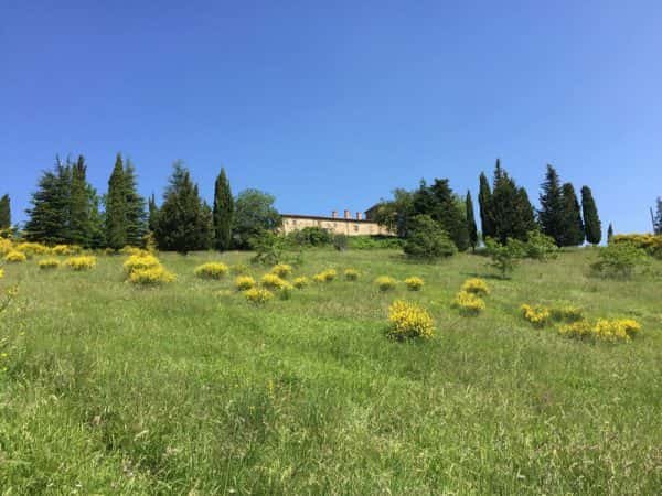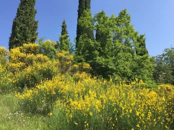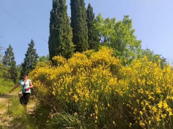 Dopo circa un chilometro si giunge alla Collinaccia (640 m.), punto più alto dell’escursione. Ancora 200 metri e si imbocca a sx una strada bianca indicata come via della collina. Poco oltre, una sbarra lascia il passaggio solo a piedi e in bici. Da questo punto, fin quasi a fondo valle, siamo immersi nelle ginestre in fiore. Uno spettacolo molto bello, considerato il giallo vivo dei fiori in contrasto con il verde delle alberature e l’azzurro del cielo di questi giorni. Un’altra caratteristica che si coglie è quello dei buoni profumi, da quello caratteristico delle ginestre, ad altri che si fatica ad individuare.