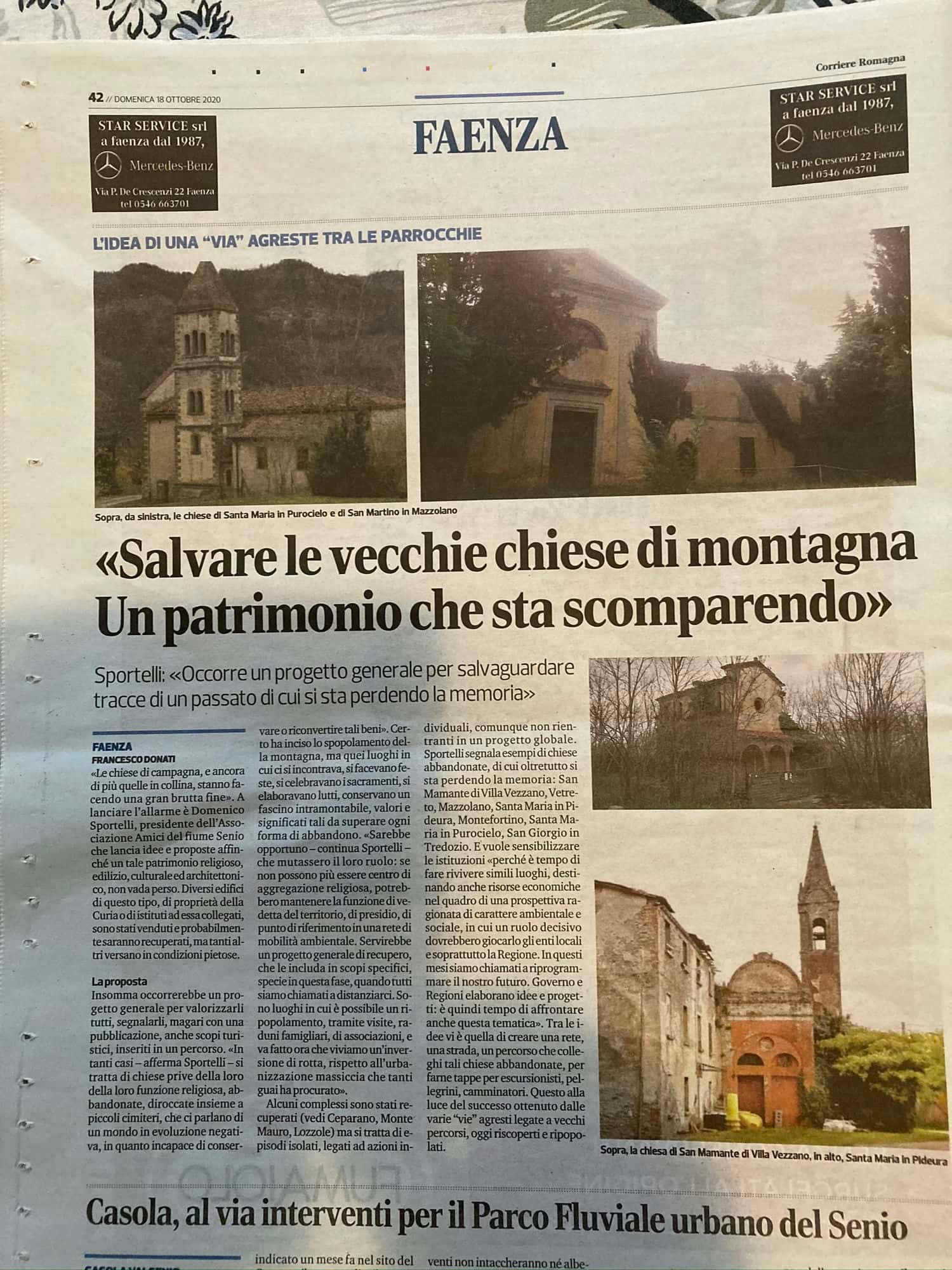 Domenica scorsa il Corriere di Romagna ha dedicato quasi l’intera pagina di Faenza al tema delle chiese di campagna abbandonate. Il giornalista, Francesco Donati, che ringrazio, ha preso spunto per il suo lavoro da un articolo che avevo scritto nel mio sito. Il tema era quello dello stato di abbandono di tante chiese di collina e montagna e del fatto che entro pochi anni rischiano di sparire. A questo dato si aggiunge anche la vita delle chiese di campagna in pianura che vedo in difficoltà e che stanno gradualmente, almeno a me pare, perdendo di identità.