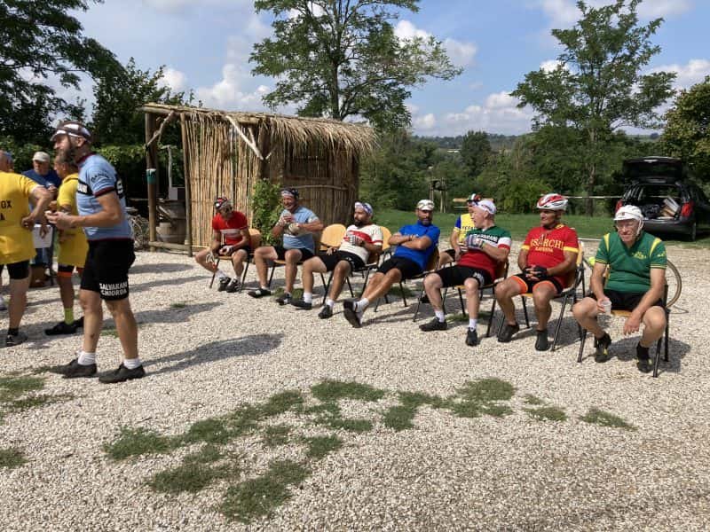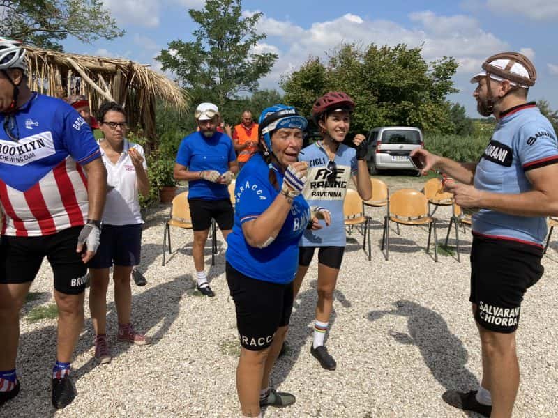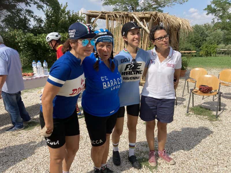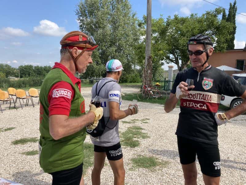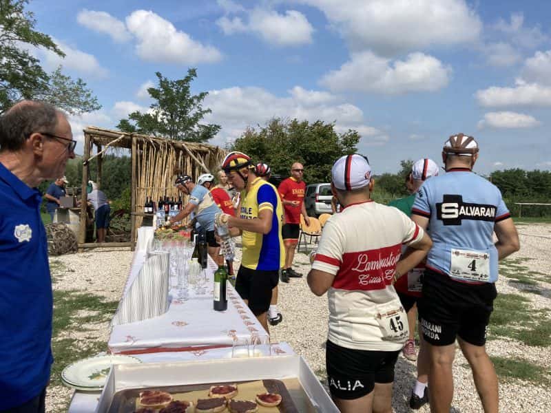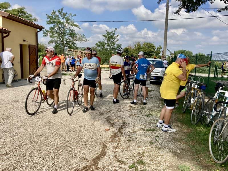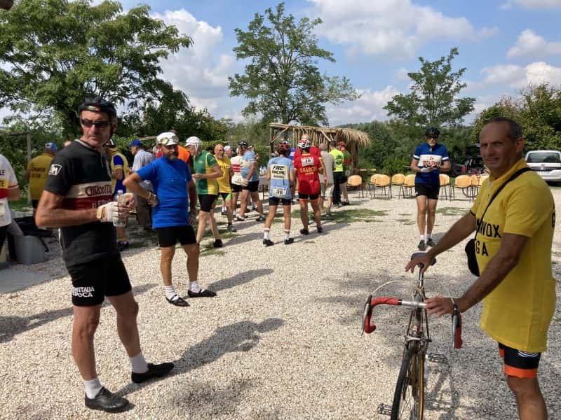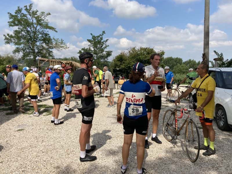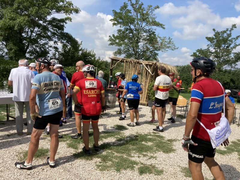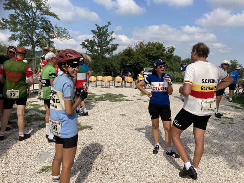 C’erano corridori da diverse parti d’Italia, tutti con le divise di un tempo che ci hanno ricordato i vecchi marchi sia tecnologici che pubblicitari. L’unico non in divisa era Oscar Pirazzini, un bel personaggio del ciclismo di quei tempi, promoter dell’iniziativa che si è rammaricato di non avere potuto percorrere il nuovo tratto di ciclo via del Senio a Castel Bolognese. La causa è che c’è ancora il cantiere in corso, ma sarà per la prossima volta.