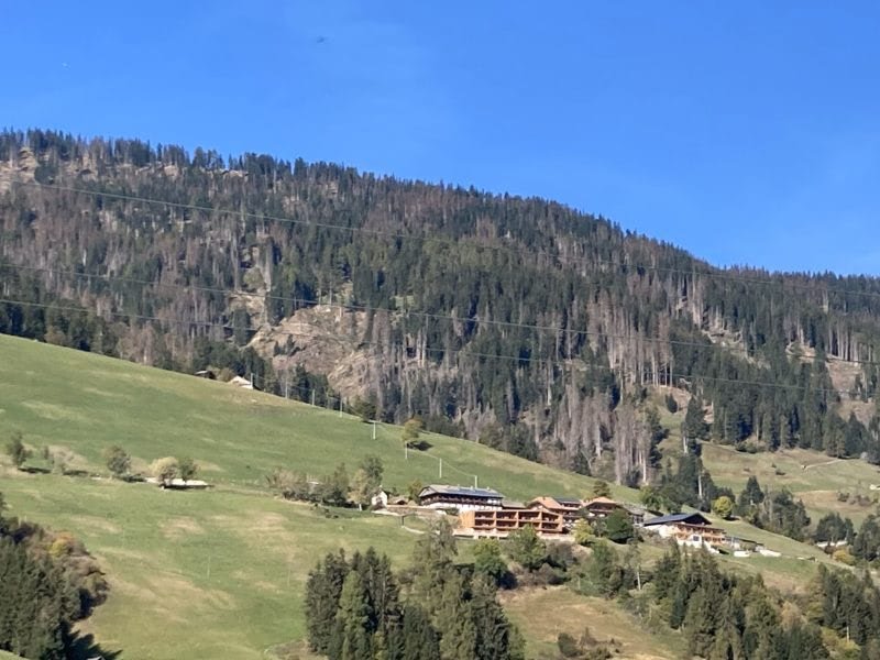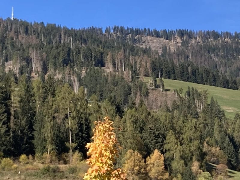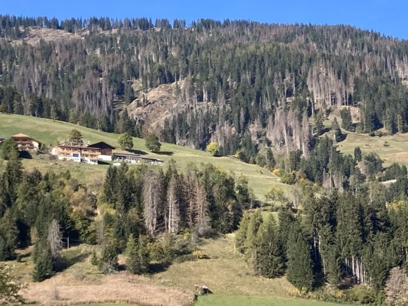 Si dice che in Austria intere montagne siano già brulle. Io nei giorni scorsi ero in val Pusteria e debbo dire di essere rimasto impressionato. Il bosco di abeti rossi che copriva quasi interamente tutti i pendii delle montagne, lasciando intravedere solo piccoli prati pascolo attorno ai masi, quest’anno appare molto diverso. Gli abeti si sono rarefatti, le zone dove l’albero è già stata spiantato sono tantissime e altrettante quelle dove gli alberi sono secchi. Mucchi di tronchi ammassati ovunque. Il paesaggio è completamente cambiato in peggio, più brullo. meno verde.